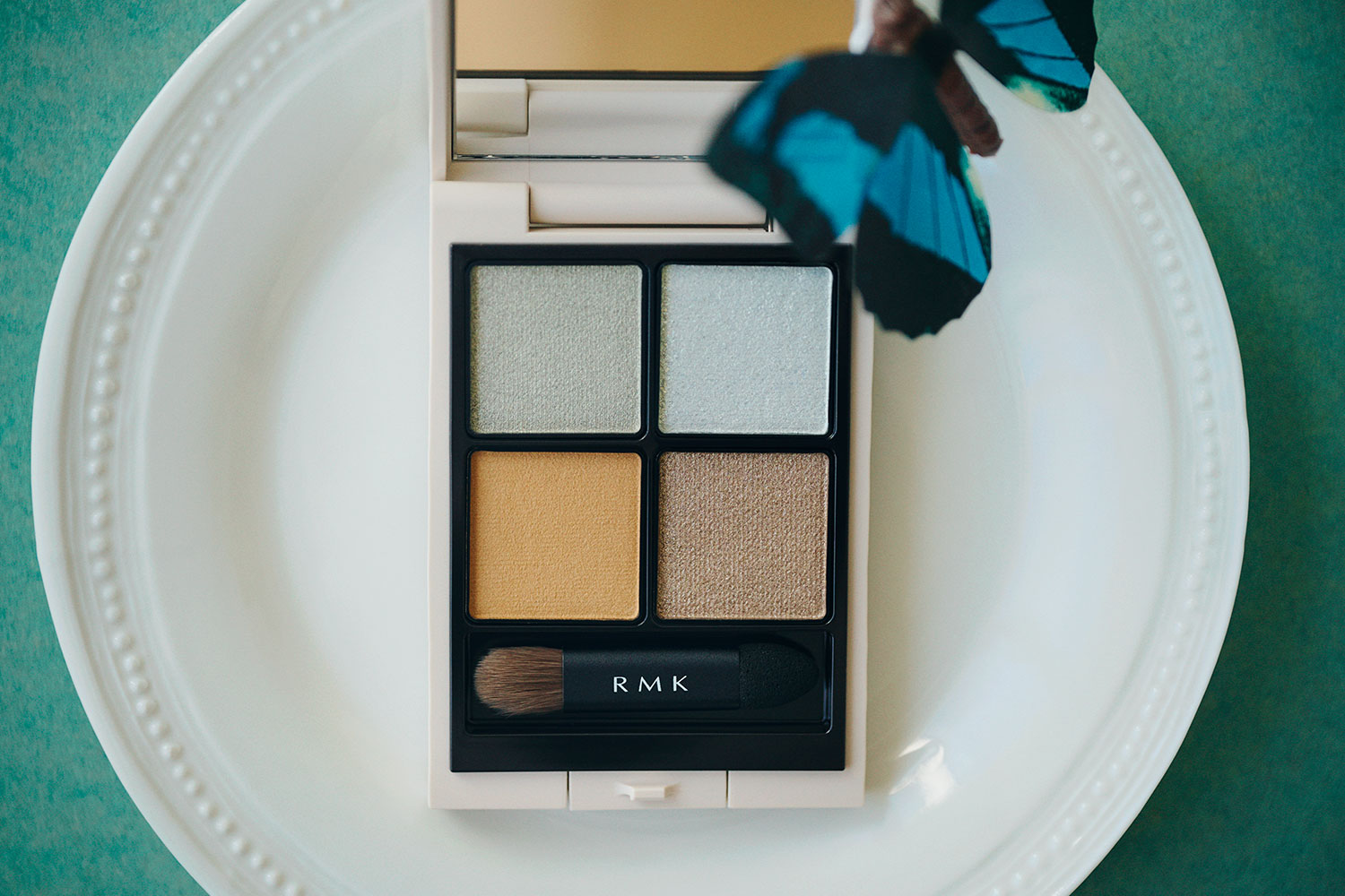 ゴールドパールを含んだカーキ、ゴールドとシルバーの光*が瞬くライムイエロー、肌なじみいいイエローカーキ、微細なゴールドとシルバー、青と赤のパールを含んだまろやかブラウン。くすみトーンが都会的なムードを、微細なきらめき*が春の軽やかさをさりげなく表現するパレット。ベーシックだけど無難にならないところはさすが、RMK。