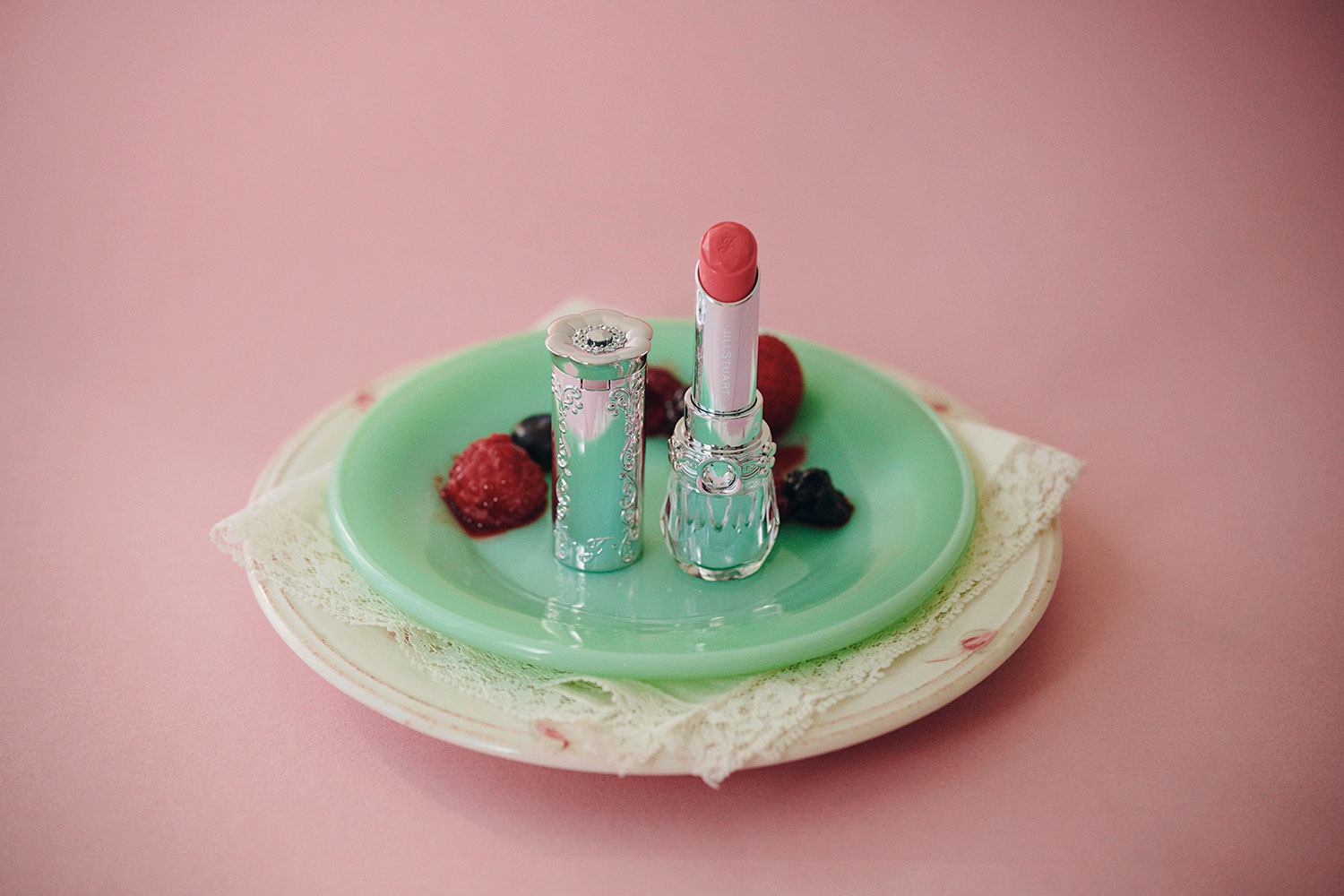 唇の上でとろけるように伸び広がる、メルティなリップ。今回のメイクに使用した03は、ノンパールで濁りのない発色のチェリーピンク。みずみずしいツヤと色みの相乗効果で、まるでヒロインみたいな可憐さをもたらす。清涼感のある成分*2を配合しているので、つけるたびに唇が心地よく、ひんやり。