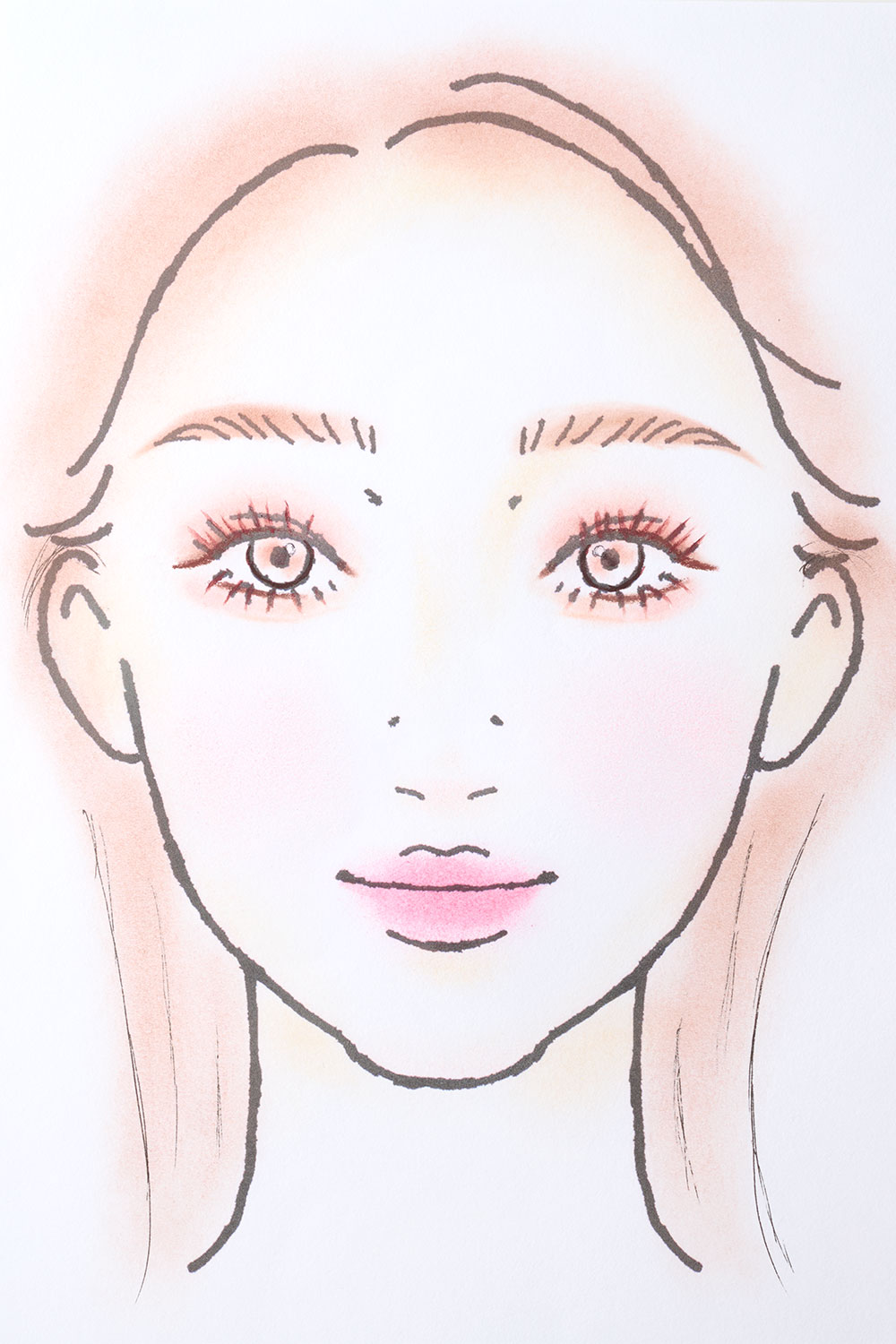 「ピュアでクリーンなツヤ発色のピンクリップを主役に据えて、ジルスチュアートらしいロマンティックな甘さを満喫できるメイクアップ。目元にはリップと同じピンクでも少しくすんだトーンとベージュの組み合わせのシャドウパレットやカシスベージュのアイブロウアイテムを選び、頰には柔らかなムードのピンクチークとカシスカラーのクリームチークを重ねてじわりとした血色感*を演出。アイメイクとチークの甘さを少しだけ抑えることで、リップの魅力をより引き立てています」(北岡さん)