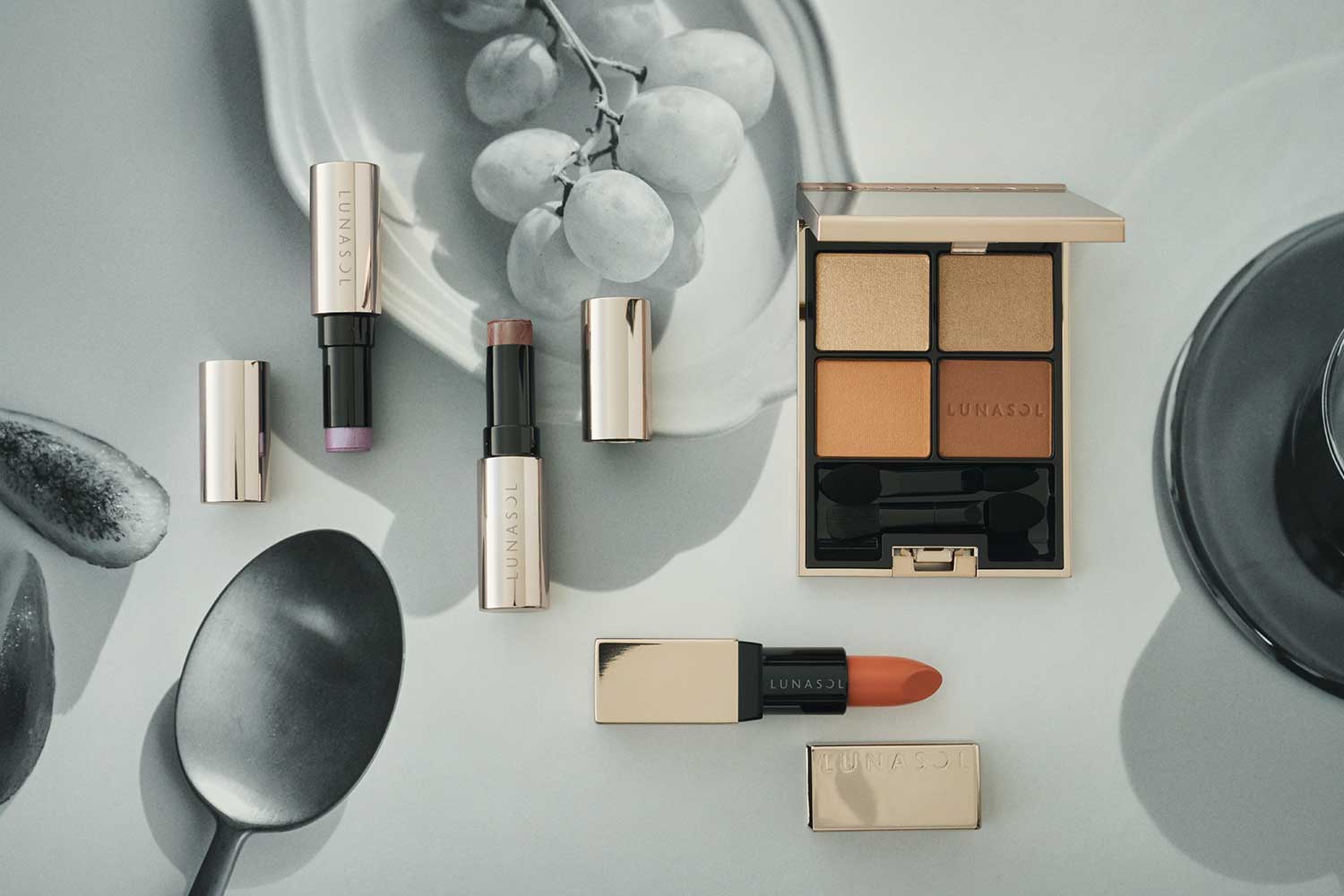 透け感と繊細なパールが美しいブラウンベージュのアイパレット、パールが効いたクリームタイプのスティック、アーシーなカラーのリップなど、端正で上質な美を紡ぎ出すアイテムが豊富なルナソルの新コレクション。ベーシックカラーだけど新しい。シックなのに大胆。この二面性はルナソルなればこそ!