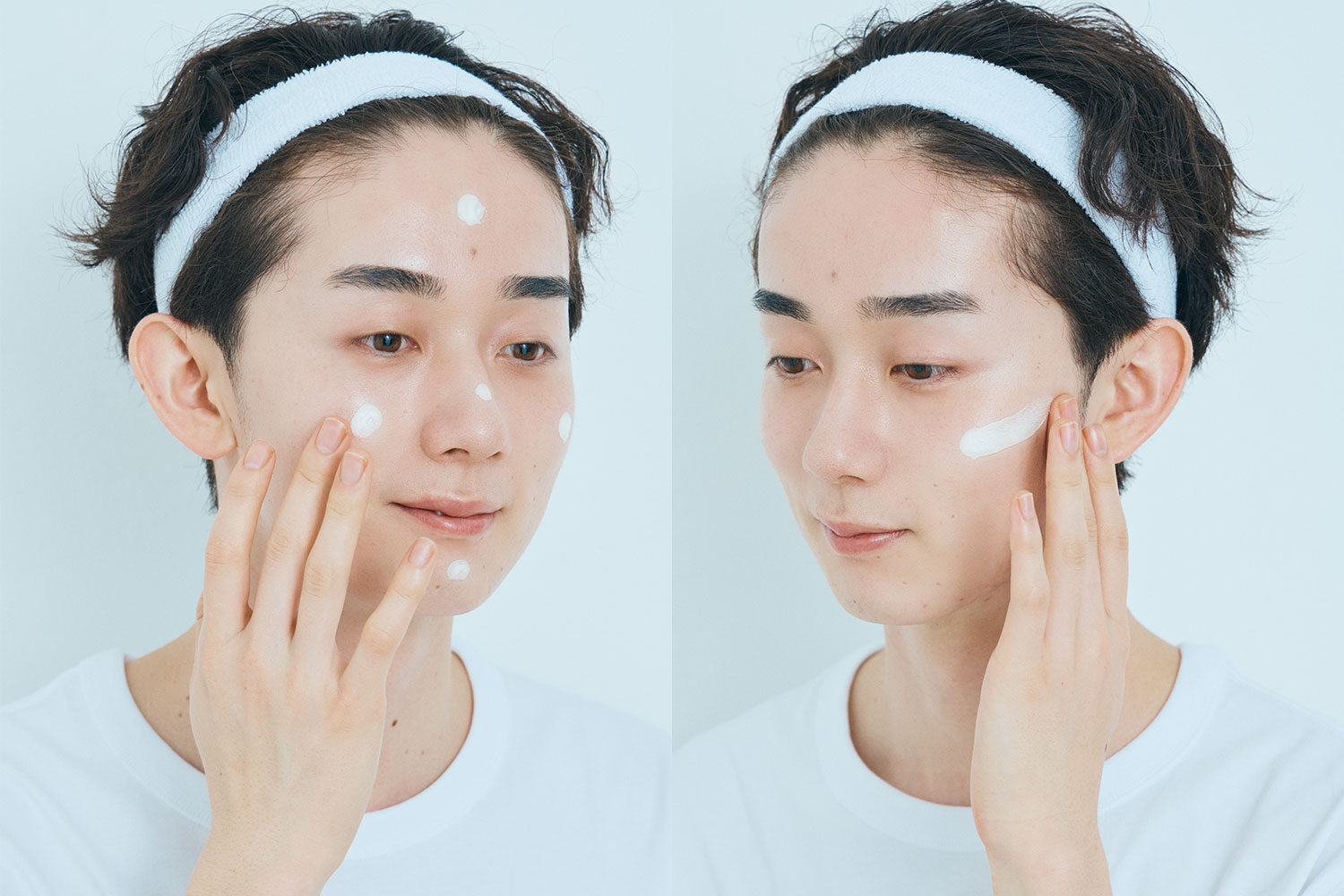 ムラ焼けを防ぐため、日焼け止めはたっぷり。パール2粒程度の量を額、鼻、頬、顎に5点置きする。