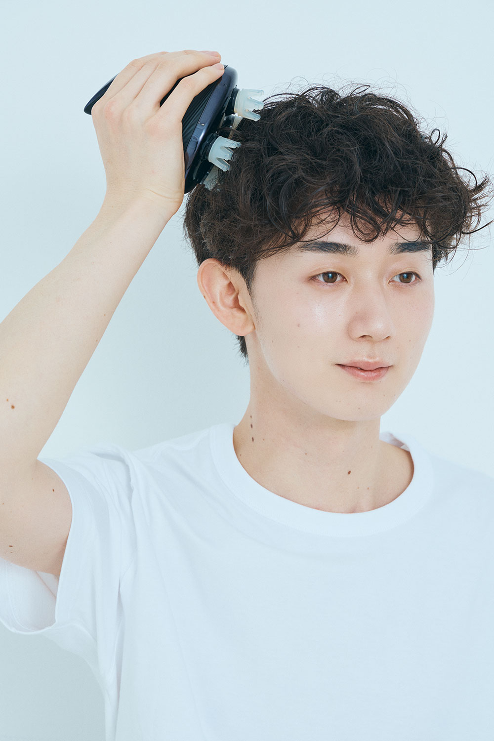頭皮に軽く押し当てスイッチをオン。スマホなどの疲れが出やすい側頭部や頭頂部は特に念入りに行って。